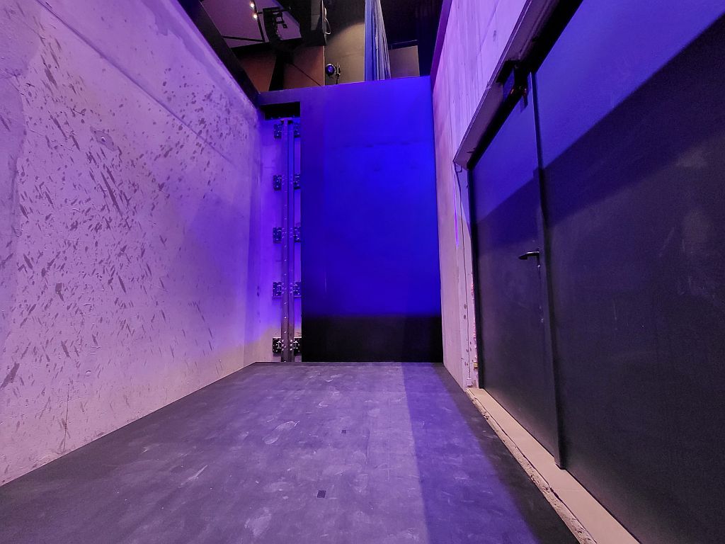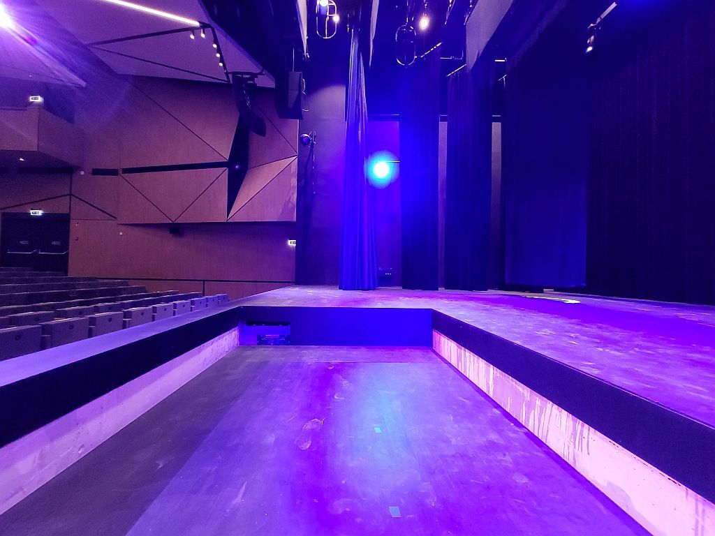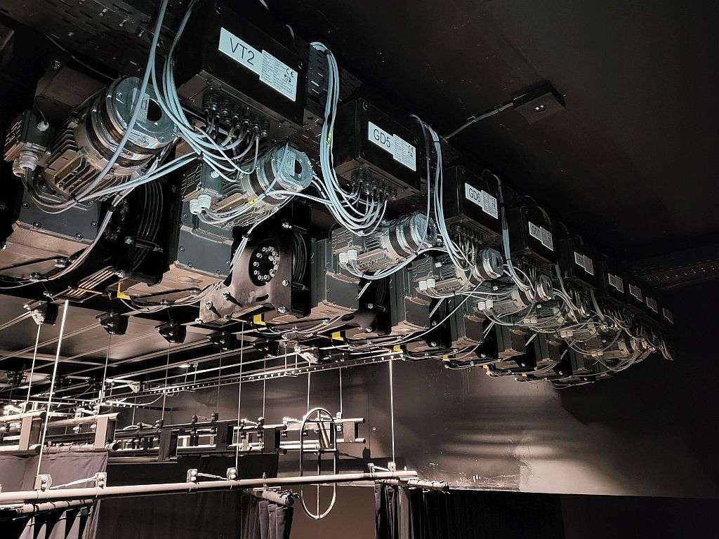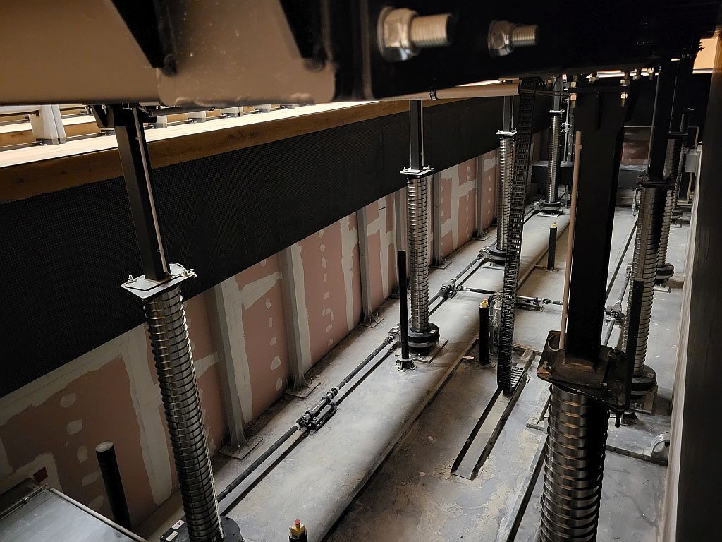 A színpadi felsőgépészet vezérlésének elhelyezésére csak a színpadtérben volt lehetőségünk. Továbbá, a nézőtéri világítási tartók gépészeti egységei a nézők számára látható módon kerültek kivitelezésre.