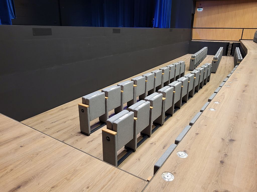 A zenekari árkon elhelyezett mobil székek fogadószerkezetét úgy kellett megtervezni majd kialakítani, hogy a székek elbontása után is esztétikus maradjon a burkolat.