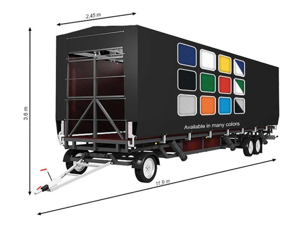 Méretek kinyitva, mint színpad: 10,0 m x 6,0 m x 6,1 m (10,0 m x 6,0 m x 7,0 m - opcionális)