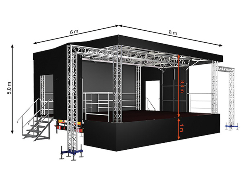 Méretek kinyitva, mint színpad: 8,0 m x 6,0 m x 5,0 m