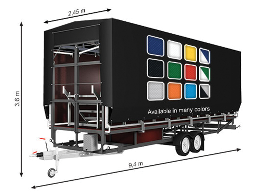 Méretek pótkocsiként: 9,4 m x 2,45 m x 3,6 m