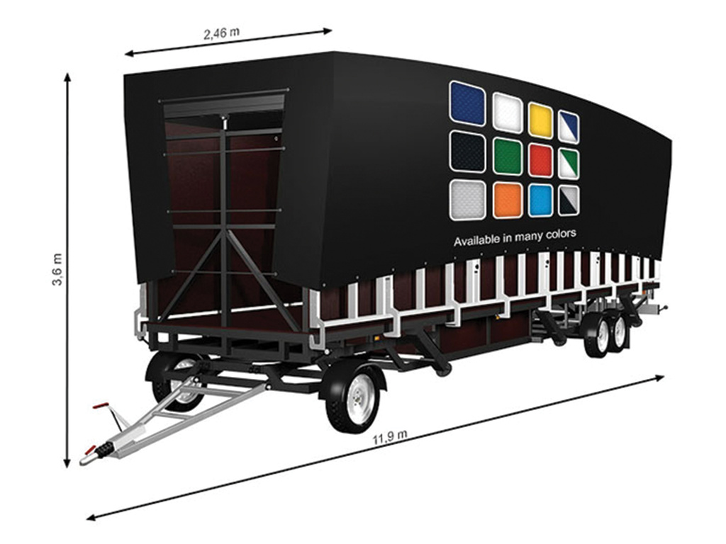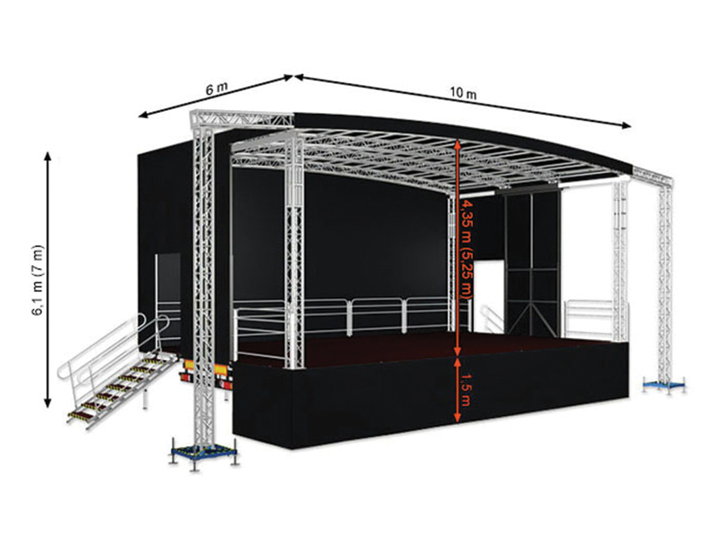 Méretek kinyitva, mint színpad: 10,0 m x 6,0 m x 6,1 m (10,0 m x 6,0 m x 7,0 m - választható)
