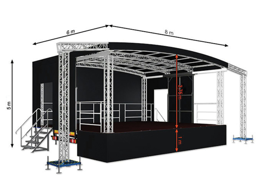 Az időjárásálló, csúszásbiztos, 48 négyzetméteres utánfutós mobil színpad profilozott / íves tetőszerkezettel, rendezvények és szabadtéri elődadások kelléke!