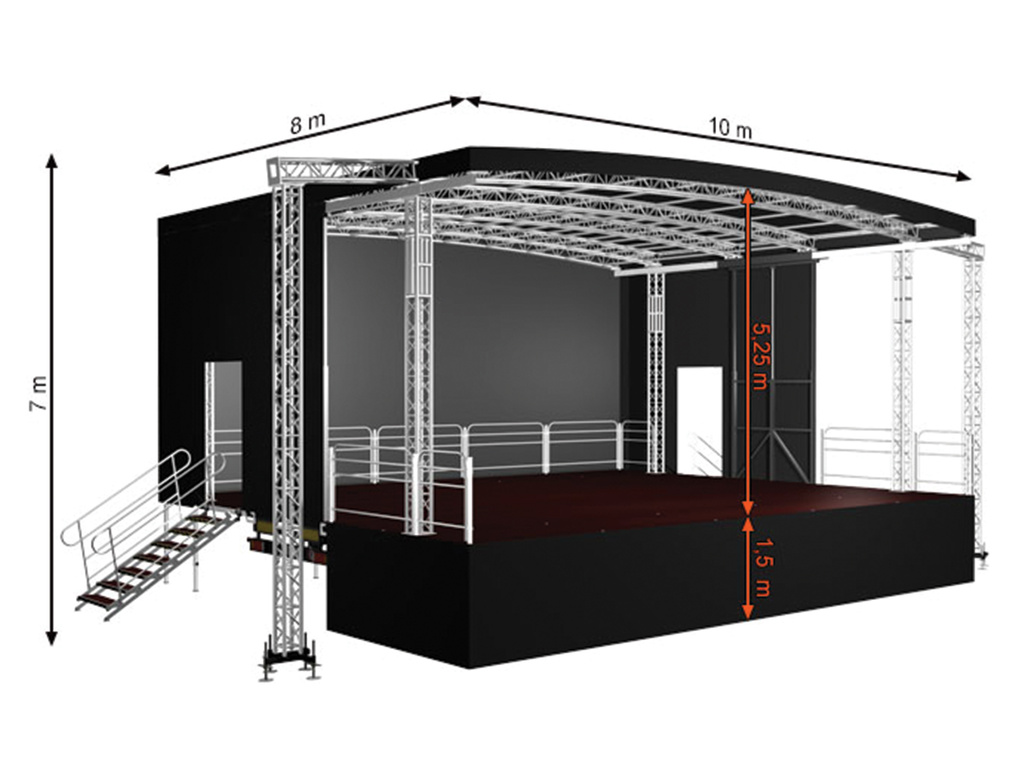 Méretek kinyitva, mint színpad: 10,0 m x 8,0 m x 7,0 m