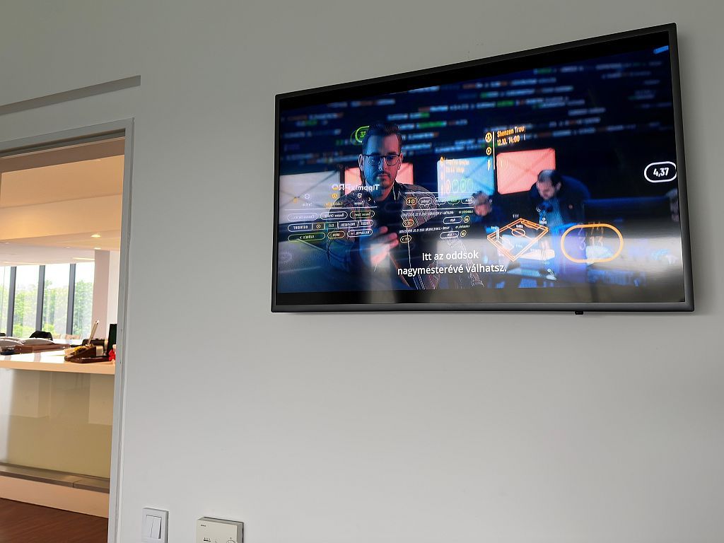 A kisebb helyiségekben 43” méretű képernyőket, míg például a VIP teremben nagyobb, 55” képátmérőjű monitorokat használnak.