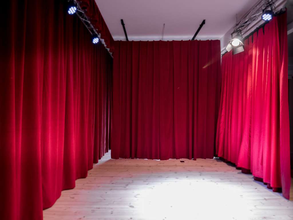 A bársony előfüggöny varrás: A Gerriets Ascona 400-as textíliából egy 5,7x3,8 méteres előfüggönyt, két 3,5x3,8 méteres oldaltakaró-függönyt és egy 6x3,8 méteres háttérfüggönyt szereltünk fel. Az oldaltakaró-függönyök (színpadlábak) a megszokottól eltérően horizontálisan, oldalirányba szűkíthetők, hogy kisebb létszámú előadás esetén is arányos legyen a színpadkép.