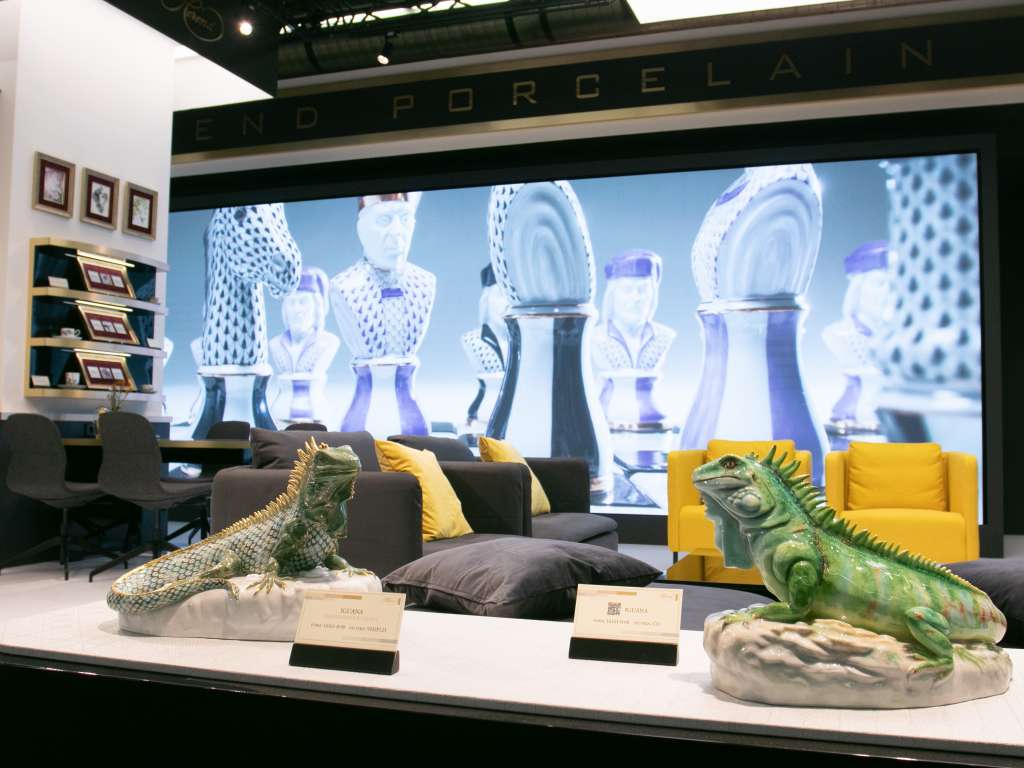 Instalarea și operarea ecranului LED de înaltă rezoluție integrat în standul companiei Herendi Porcelánmanufaktúra Zrt. la expoziția Ambiente din Frankfurt.