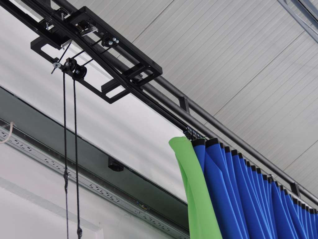 Pentru a se asigura că materialul poate fi întins perfect fără tensiune, compania noastră a fabricat o pereche de șine curbe în partea de sus și de jos, pe care am reușit să instalăm materialul Television CS de 35 x 7,4 metri, care a fost asamblat în camera noastră de cusut, fără nicio tragere.