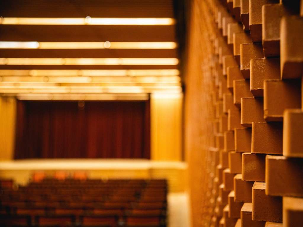 În sala de concerte, am folosit un total de 407 metri pătrați de material pentru a crea o perdea cusută care reflectă sunetul, din catifea Clivia Echo.