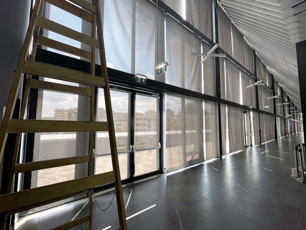 We had to cover huge surfaces on both sites. We also had to take into account that the lines of the darkening curtain system were far from horizontal, thus we had to plan with different leveling rates.